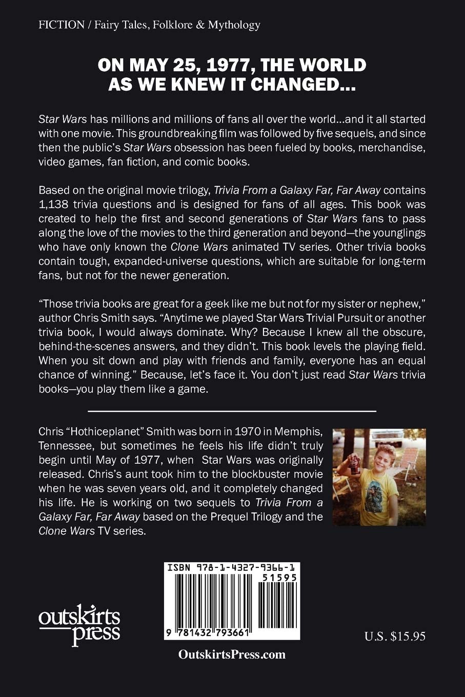 Based on the original movie trilogy, Trivia From a Galaxy Far, Far Away contains 1,138 trivia questions and is designed for fans of all ages. This book was created to help the first and second generations of Star Wars fans to pass along the love of the movies to the third generation and beyond--the younglings who have only known the Clone Wars animated TV series. Other trivia books contain tough, expanded-universe questions, which are suitable for long-term fans, but not for the newer generation.